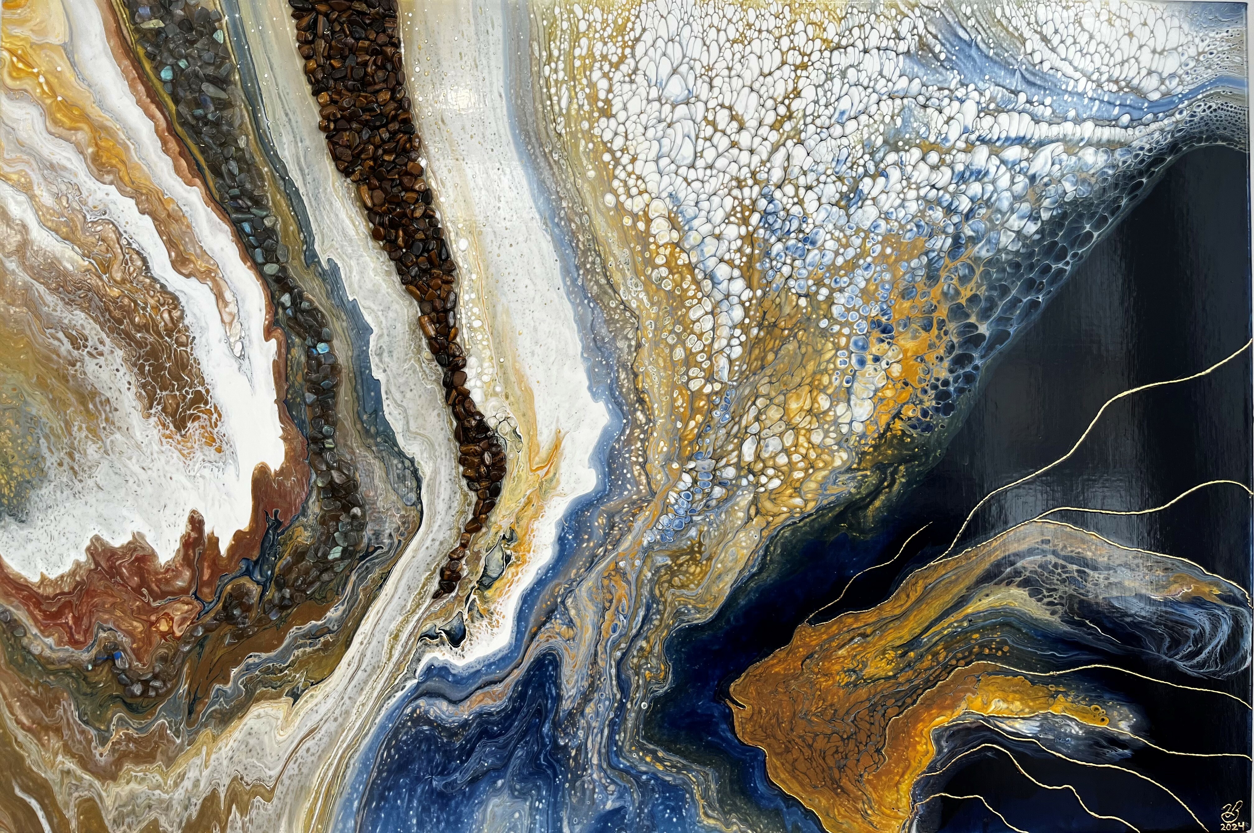 MÉDIUM : Coulée d’acrylique, pierres labradorite et œil de tigre