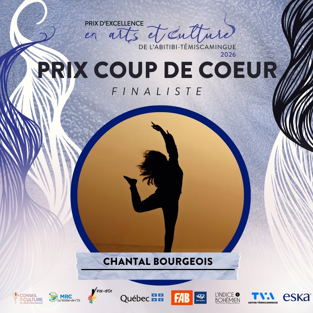 Fondatrice du studio de danse Spect-O-Art, Mme Chantal Bourgeois est finaliste du Prix coup de cœur, lequel reconnaît l’excellence, le rayonnement et le dynamisme d’un(e) artiste professionnel(le) dont l’impact a été significatif dans le milieu artistique et culturel du territoire hôte, soit la MRC de La Vallée-de-l’Or.