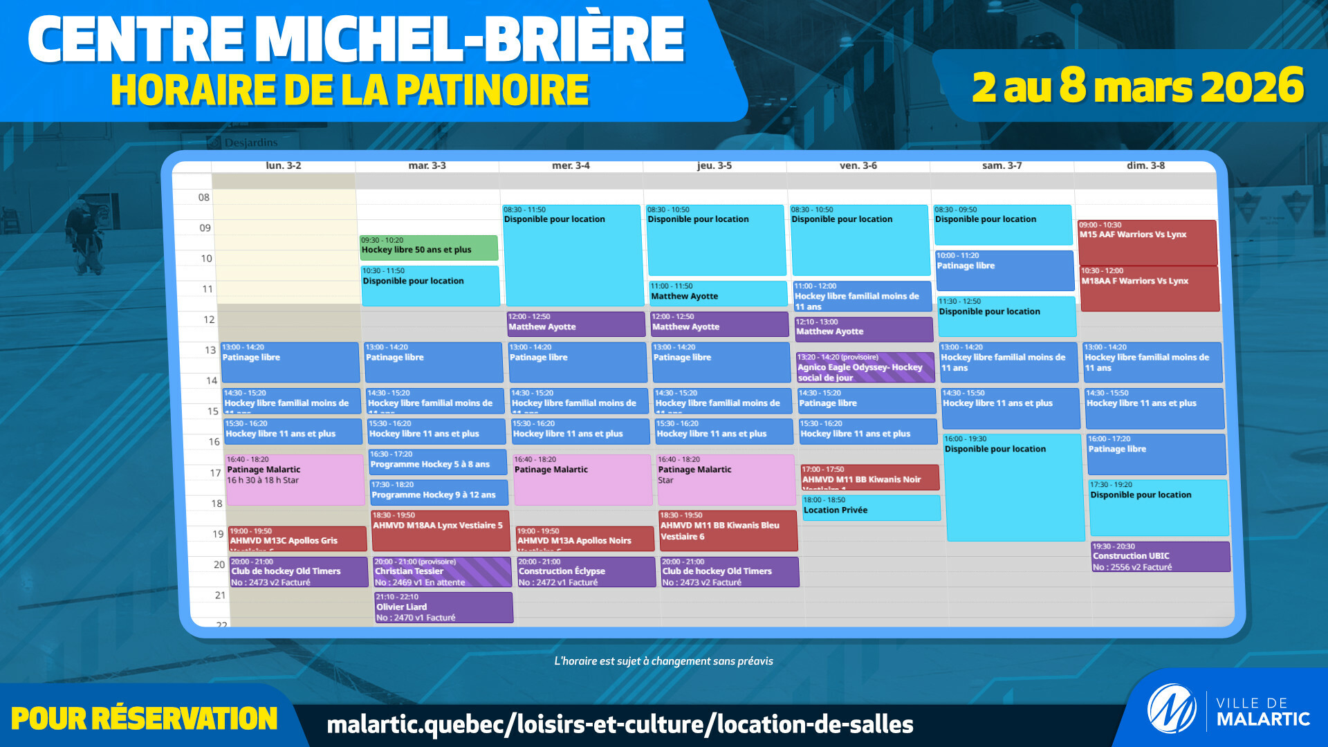 Horaire de la patinoire | 2 au 8 mars 2026