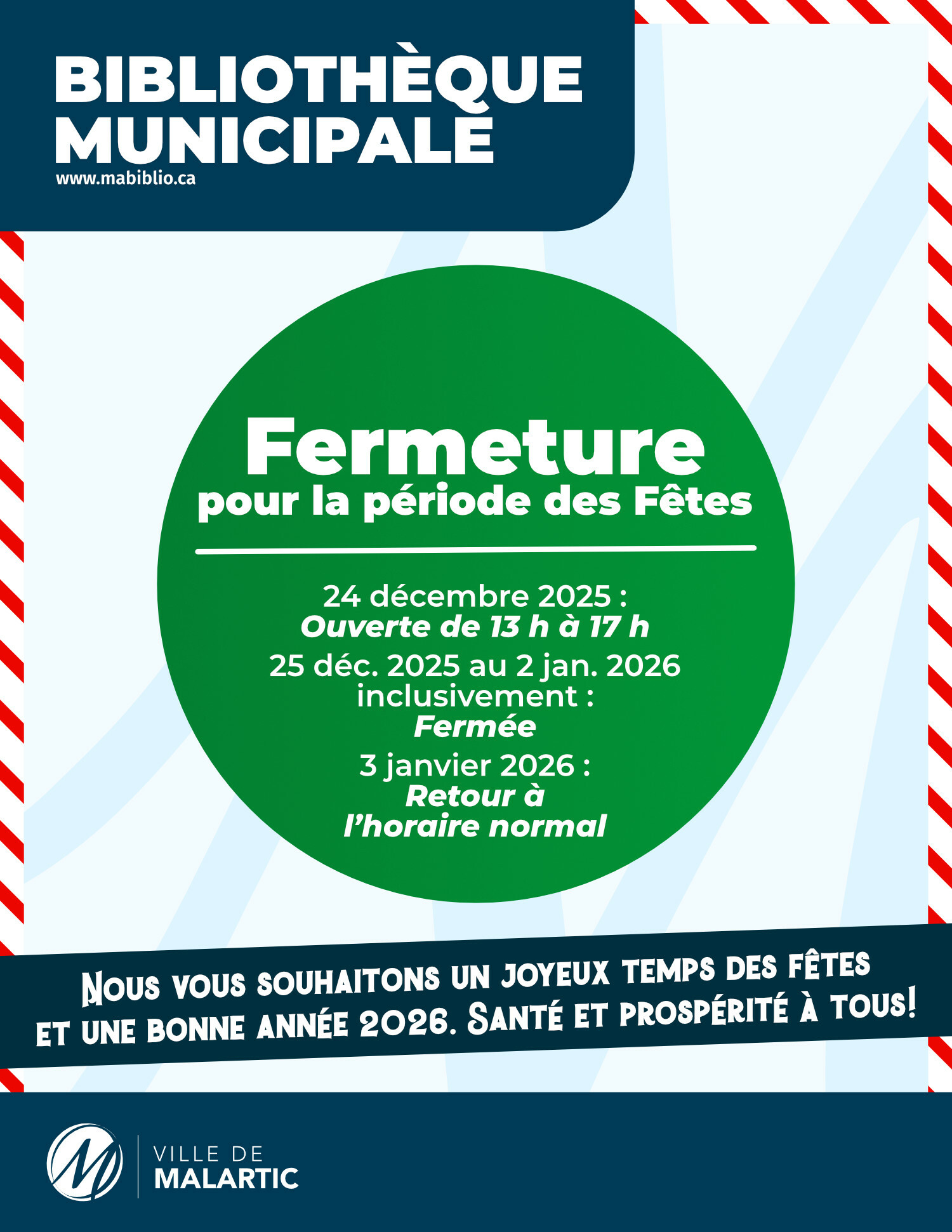 - La bibliothèque municipale sera ouverte le 24 décembre 2025 de 13 h à 17 h.Elle sera fermée du 25 décembre 2025 au 2 janvier 2026 inclusivement. Retour à l’horaire normal le 3 janvier 2026.