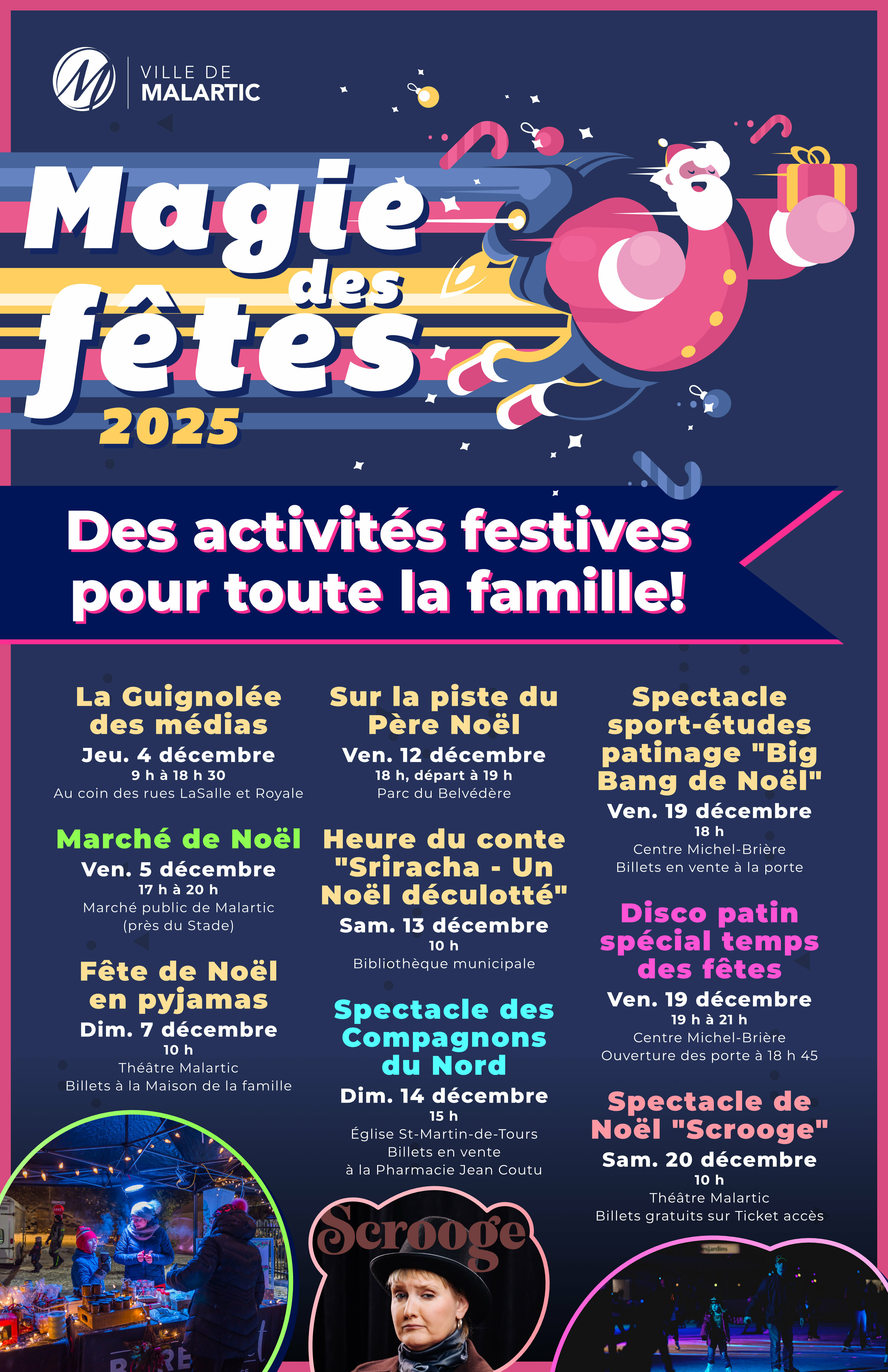 On vous présente une programmation remplie de plaisir : pyjamas, Père Noël, marché gourmand, patinage coloré et plein d’activités pour faire briller votre mois de décembre!