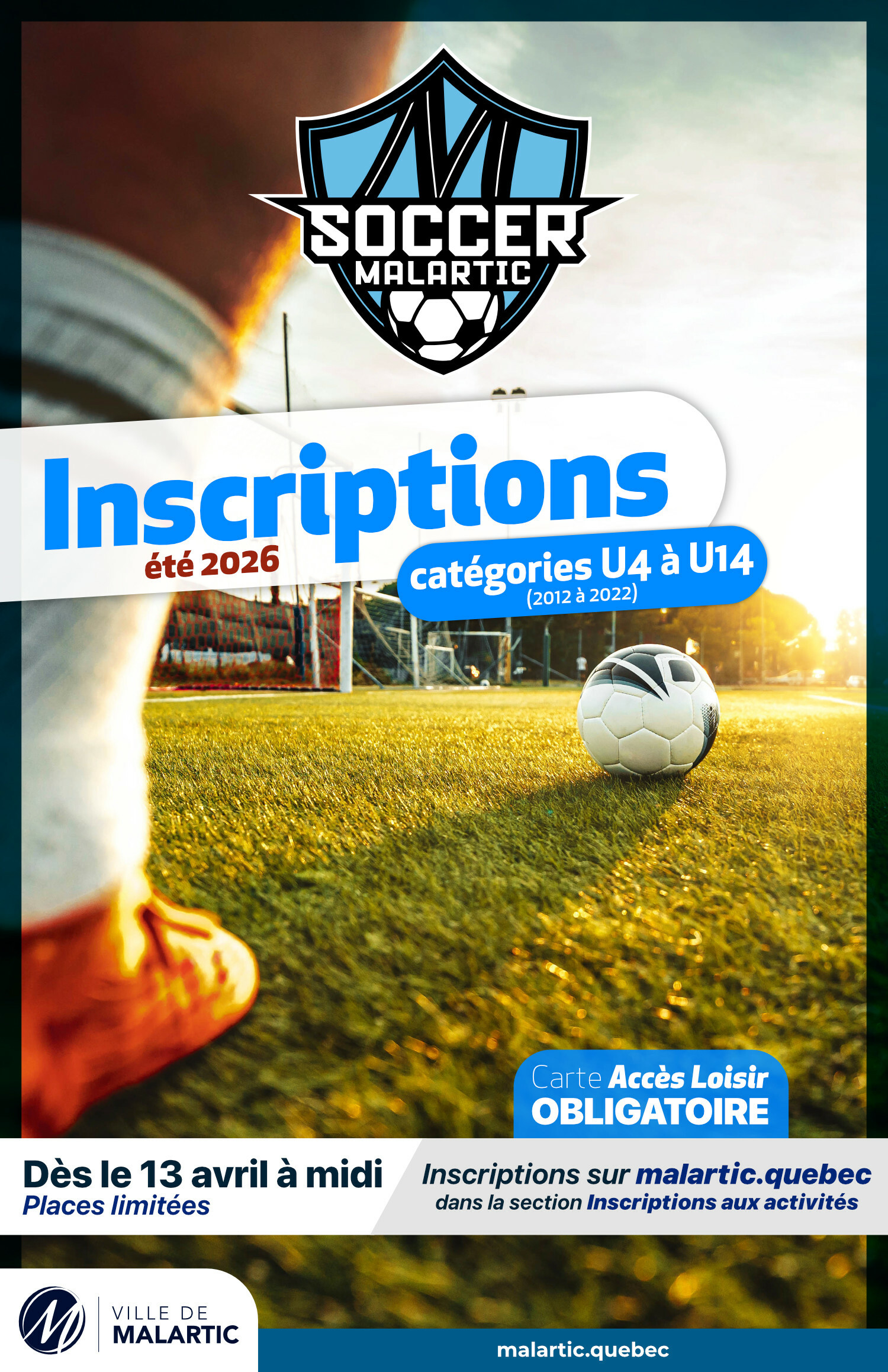 La Ville de Malartic est heureuse d’annoncer l’ouverture des inscriptions pour la saison de soccer été 2026.