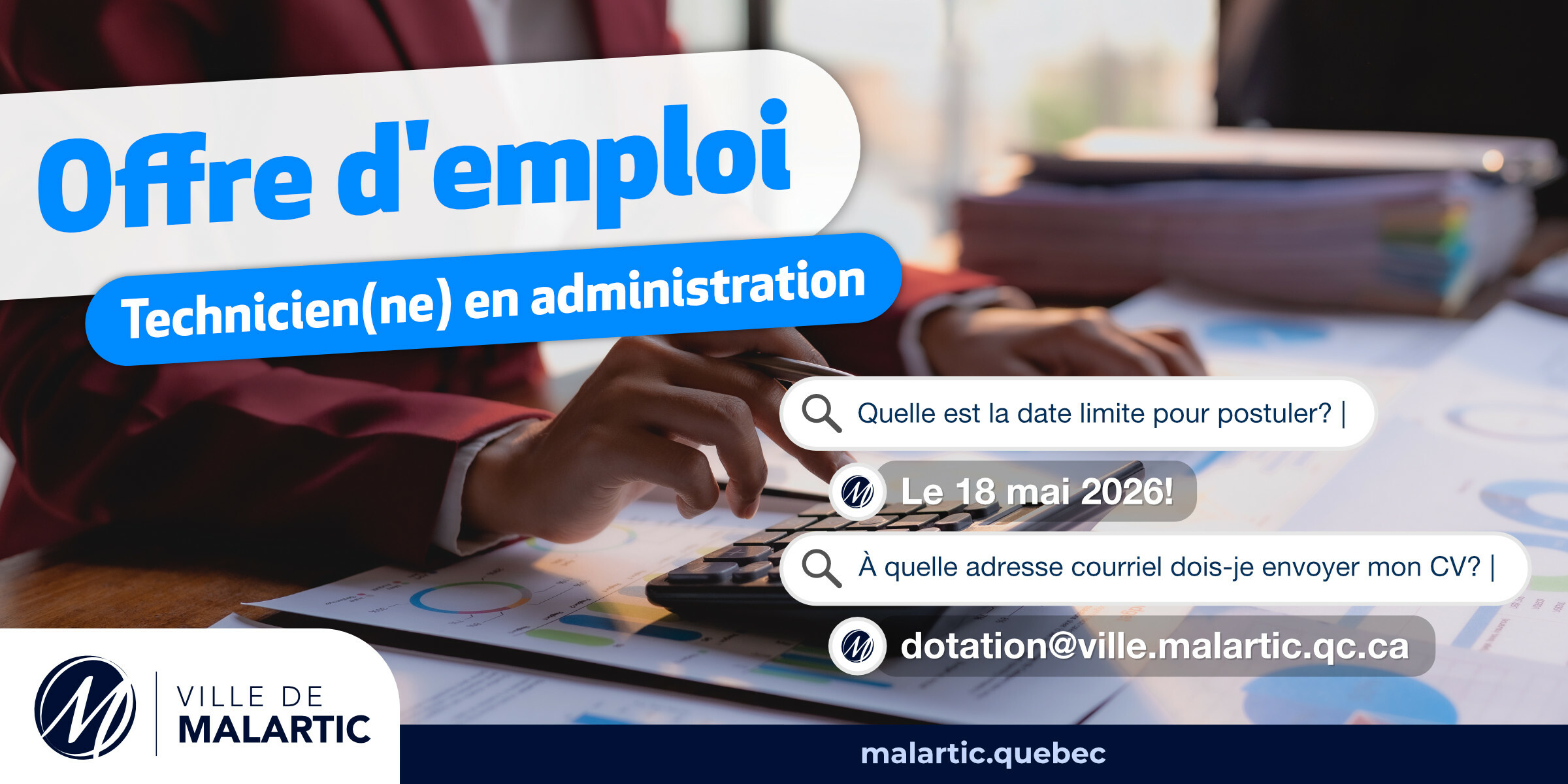 Nous sommes à la recherche d’une personne pour occuper le poste de technicien(ne) en administration au sein du Service de la trésorerie.